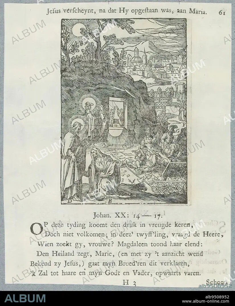 Christ appears to Mary Magdalene, Jesus verscheynt, na dat Hy risen, aan Maria (title on object), Mary Magdalene sees two angels sitting in the empty tomb. When she looks back she sees Christ dressed as a gardener. In the foreground she kneels at his feet. Various elements of the scene are accompanied by letters. Above the image is a title. Below it are six verses and a reference to John 20: 14-17. The print is part of an album., print maker: Christoffel van Sichem (II), (mentioned on object), after print by: Hieronymus Wierix, after design by: Bernardino Passeri, print maker: Amsterdam, after print by: Antwerp, publisher: Amsterdam, 1629 and/or 1740, paper, letterpress printing, height 109 mm × width 74 mm, height 168 mm × width 132 mm
