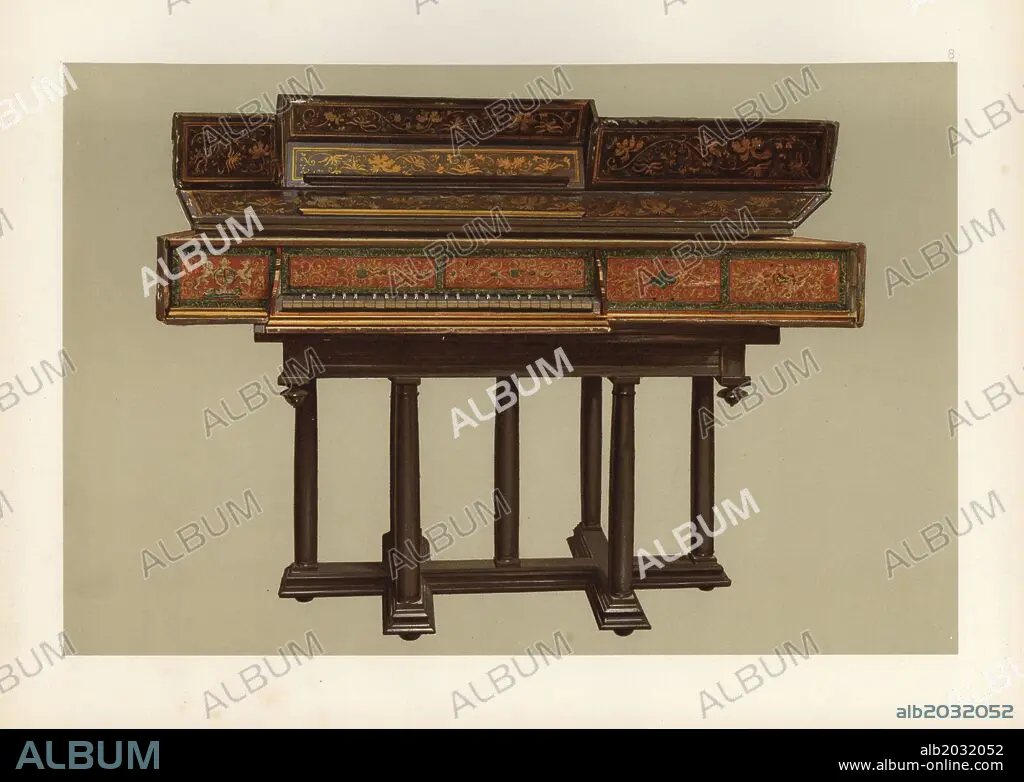 Queen Elizabeth I's virginal, made in Italy circa 1570. Chromolithograph from an illustration by William Gibb from A.J. Hipkins' "Musical Instruments, Historic, Rare and Unique," Adam and Charles Black, Edinburgh, 1888. Alfred James Hipkins (1826-1903) was an English musicologist who specialized in the history of the pianoforte and other instruments. William Gibb was a master illustrator and chromolithographer and illustrated "The Royal House of Stuart" (1890), "Naval and Military Trophies" (1896), and others.