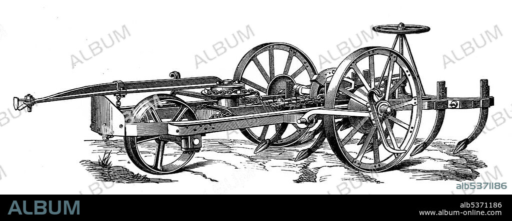 Historical graphic representation, cultivator or plough of an agricultural locomotive or tractor powered by a steam engine, dragged by a steam plough, 19th Century, from Meyers Konversations-Lexikon encyclopaedia, 1890