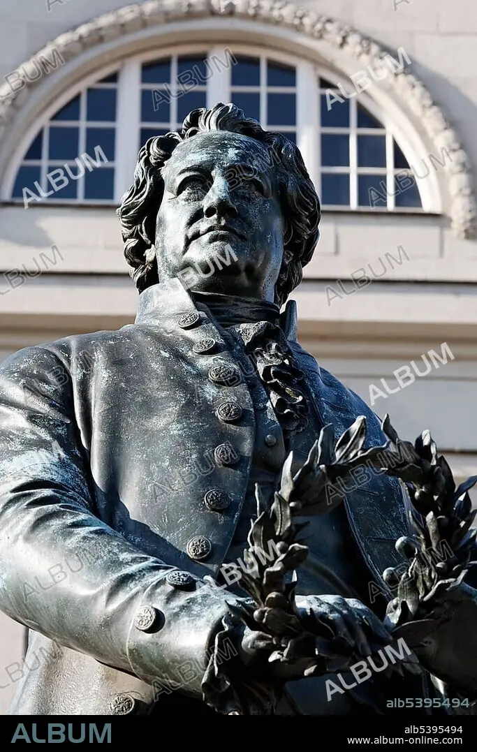 Goethe statue, Goethe and Schiller monument in front of the Deutsches Nationaltheater theatre in Weimar, Thuringia, Germany, Europe