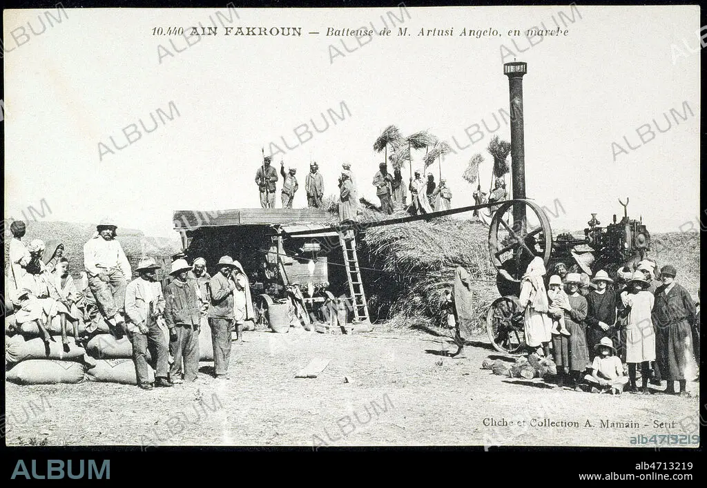 Ain Fakroun (Algerie). Batteuse de M. Artusi Angelo en marche. Photographie de A MAMAIN de Setif pour une carte postale vers 1910. Credit : Collection IM/KHARBINE-TAPABOR.