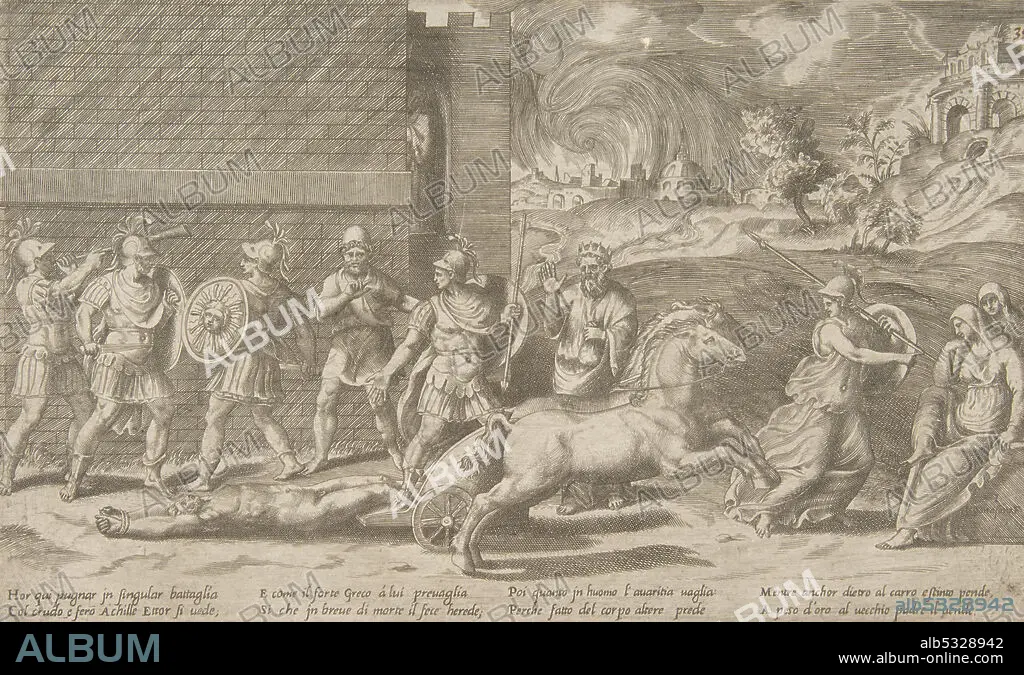 The combat of Hector and Achilles, and Achilles dragging the body of Hector around the walls of Troy, 1531-76.