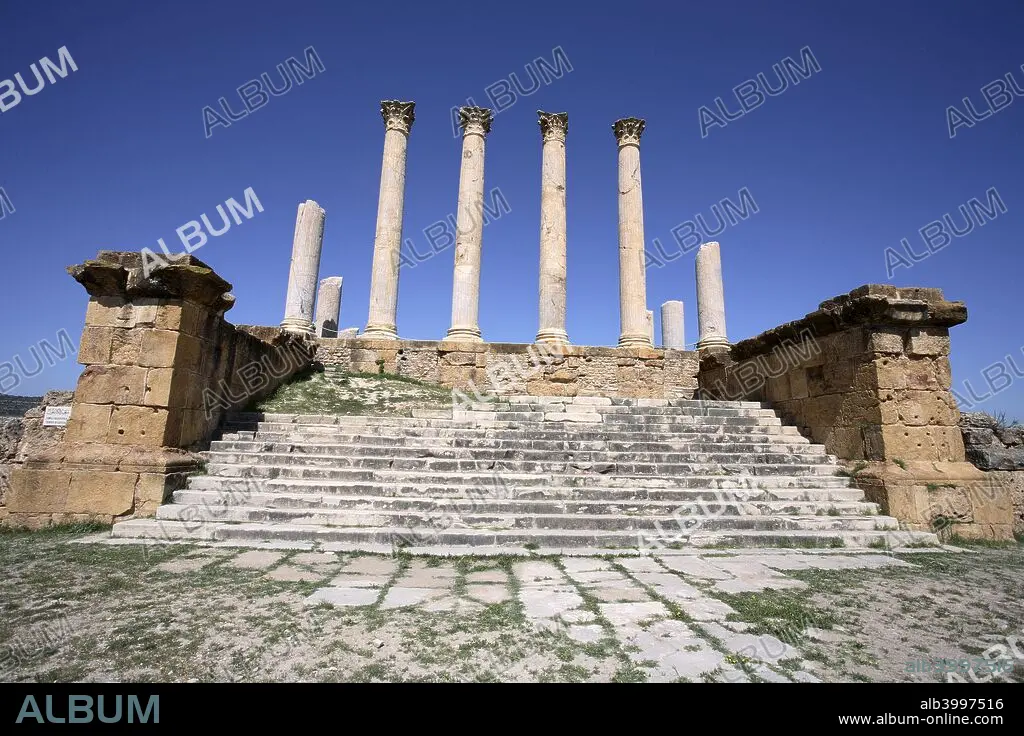The Capitolium at Thuburbo Majus, Tunisia. Thuburbo Majus (or Thuburbo Maius) is a large Roman site in northern Tunisia located approximately 60km southwest of Carthage. Construction of Thuburbo Majus began in 27BC.