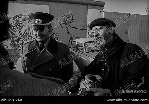 GDR, Berlin, 19 November 1989, after the demonstration on 19 November, the graphic artist Manfred Butzmann paints the Wall at Potsdamer Platz with other artists (later removed by border guards), conversation with a border officer