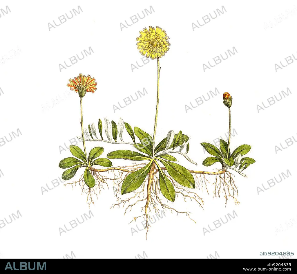 Kleines Habichtskraut, Hieracium pilosella, auch Mausohr-Habichtskraut oder Langhaariges Habichtskraut / Pilosella officinarum, synonym Hieracium pilosella, known as mouse-ear hawkweed, Historisch, historical, digital improved reproduction of an original from the 19th century / digital restaurierte Reproduktion einer Originalvorlage aus dem 19. Jahrhundert, genaues Originaldatum nicht bekannt