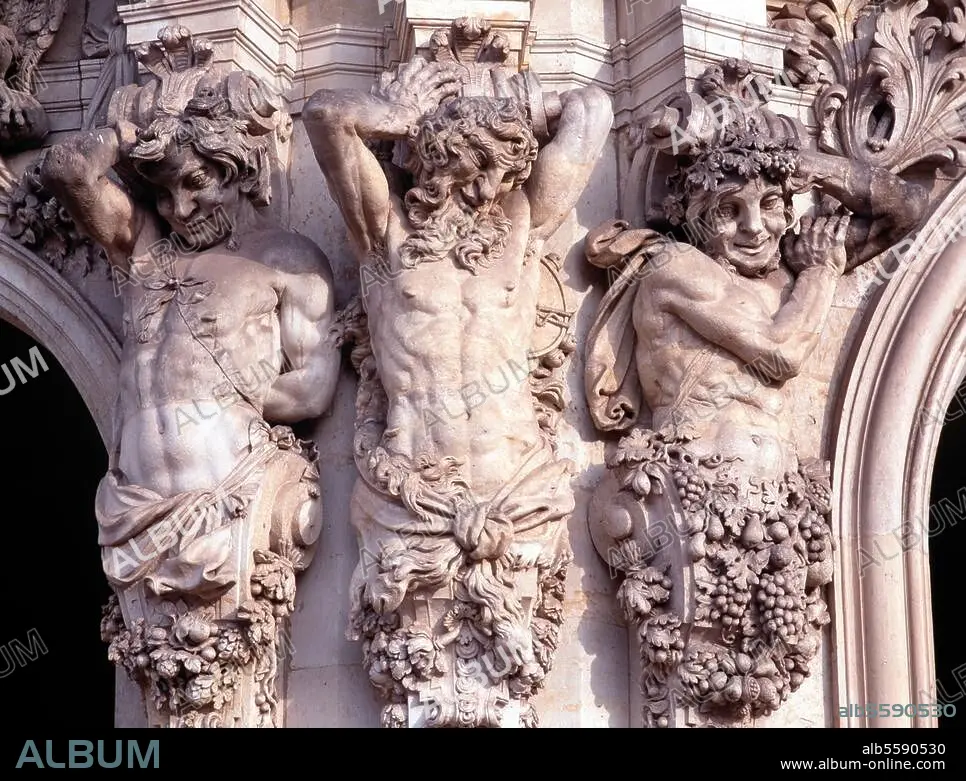 Dresden (Sachsen), Zwinger. (1709-32 erb.; Arch.: Matthäus Daniel Pöppelmann; Skulpturen: Balthasar Permoser). Teilansicht: Wallpavillon (1716), Hermenpilaster mit Satyrn. Foto (Barbara Opitz).