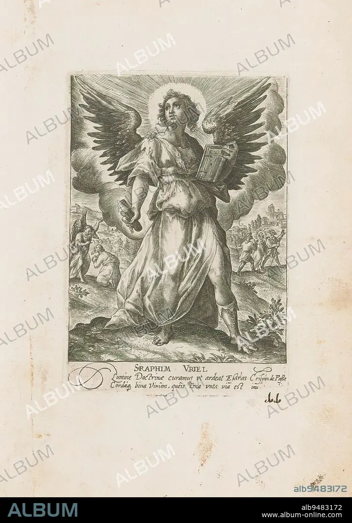 Archangel Uriel, Seraphim Uriel (title on object), Archangels and other angels (series title), Deus Pater ex quo Omnia Angeli (series title on object), Archangel Uriel with book and quiver or rolled up paper. palm branch and banner. On the left in the background, Uriel rebukes the priest Ezra. Right in the background the two disciples meeting Christ on their way to Emmaus. Part of a series of twelve depictions of archangels and other angels in this album. Part of an album of mainly Christian depictions., print maker: Crispijn van de Passe (I), after own design by: Crispijn van de Passe (I), (mentioned on object), publisher: Gerard Valck, 1585 - 1637 and/or 1670 - 1726, paper, engraving, height 145 mm × width 102 mm, height 298 mm × width 182 mm