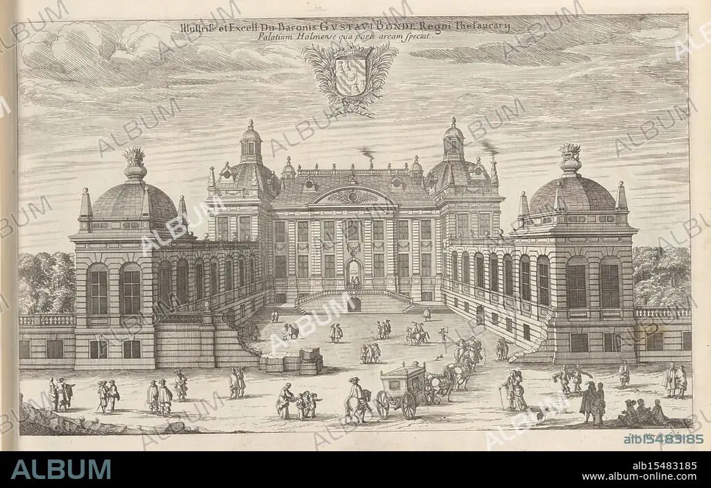 Dahlberg, Erik Jönssen, Marot, Jean (I), Suecia Antiqua et Hodierna, Illustriss: et Excell: Dn. Baronis Gustavi Bonde Regni Thesaurarij Palatium Holmense qua parte aream spectat, Palace of Gustaf Bonde in Stockholm, The print is part of an album., print, album page, prints, height 246 mm, width 375 mm, French, 1619 - 1679-12-15, print maker, printmaker, 1668 - 1668, paper, etching, Swedish, 1625-10-10 - 1703-01-16, supervision