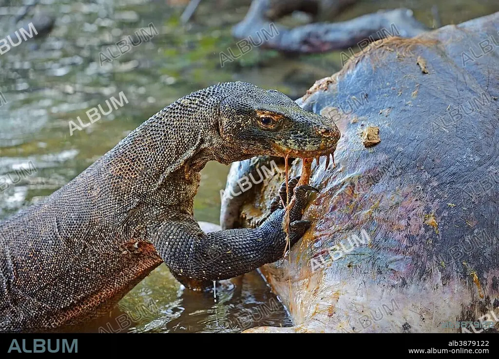 Komodo Dragon (Varanus komodoensis) feeding on the carcass of a buffalo that died in the mangrove area, Rinca Island, Komodo National Park, Indonesia, Asia.