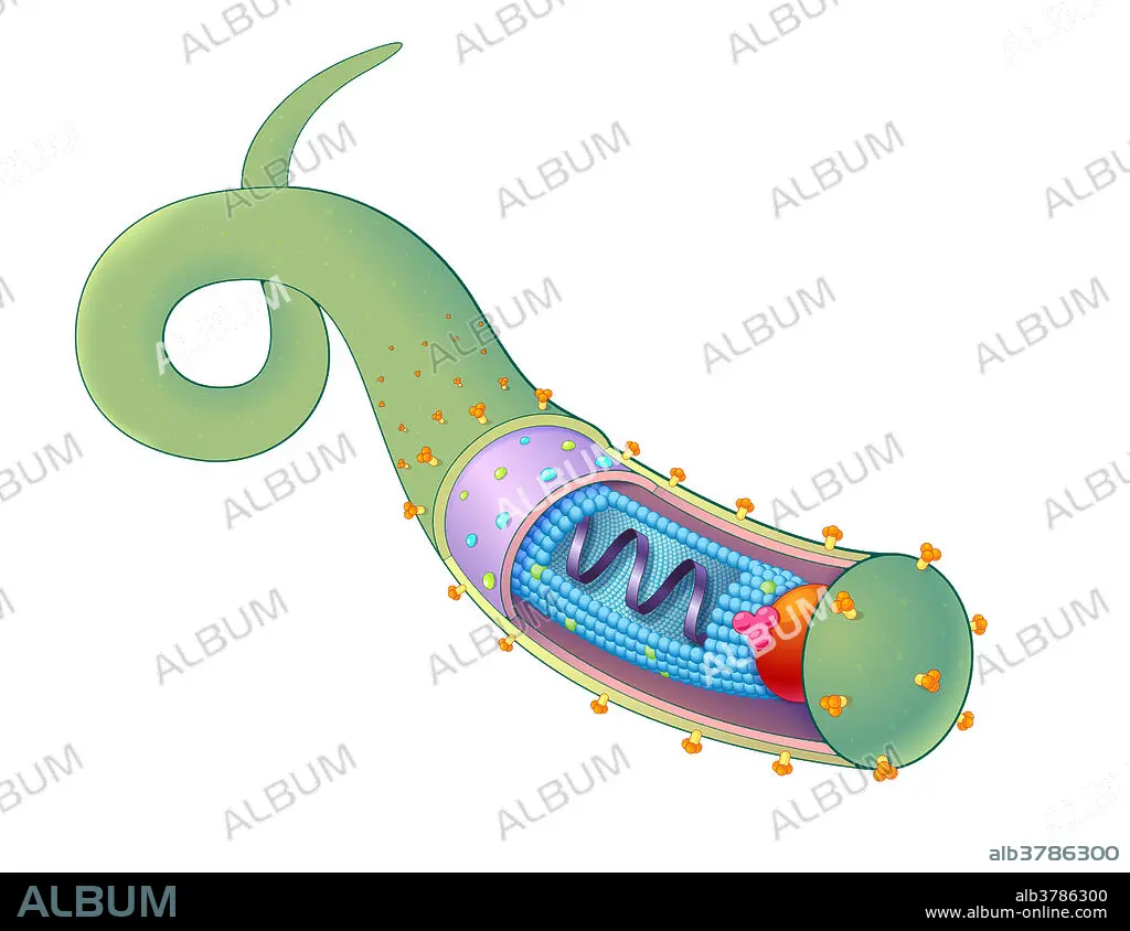 An illustrated diagram of the Ebola virus (EBOV), a virus responsible for severe haemorrhagic fever in humans and mammals, which can be transmitted through body fluids or natural reservoirs such as bats. The centre of the virus contains a single-stranded, negative-sense RNA genome and a nucleocapsid containing viral proteins VP35 and VP30. The matrix contains viral proteins VP40 and VP24, while the outer viral envelope uses glycoprotein (GP) spikes to attach to host cells. Once the virus enters a host cell, the viral RNA is translated to produce additional viral proteins. The viral proteins are enveloped using the host cell's plasma membrane and released through the process of budding, which destroys the cell.