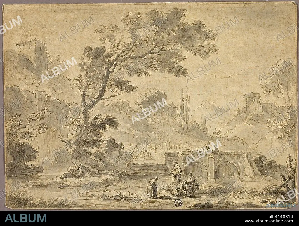 Washerwomen by Stream in Italianate Landscape. Possibly Andrea Locatelli; Italian, 1695-1741; Possibly style of Nicolas Poussin; French, 1594-1665; Possibly style of Antonio Zucchi; Italian, 1726-1795. Date: 1705-1741. Dimensions: 250 x 355 mm. Pen and brown ink, with brush and gray wash and traces of graphite, on cream laid paper. Origin: Italy.