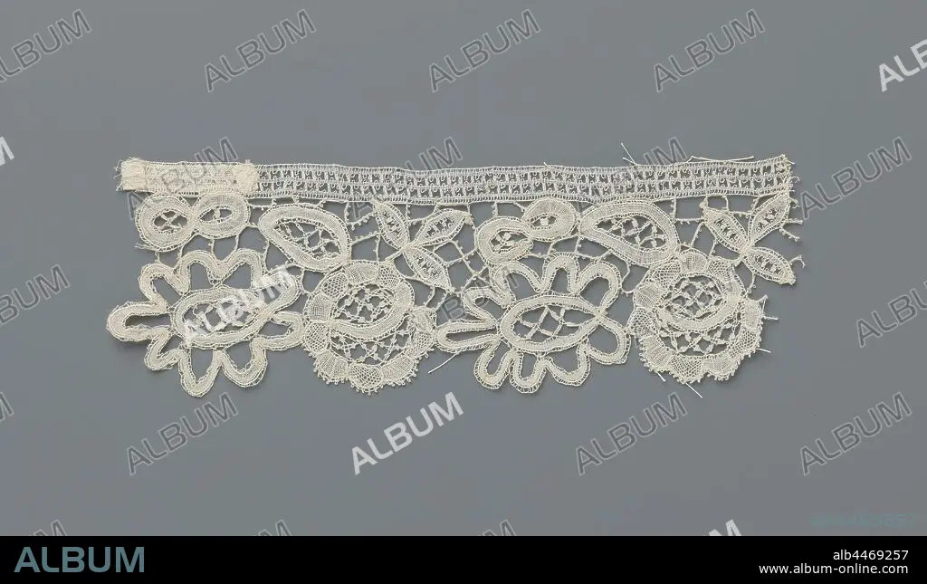 Strip of bobbin lace with alternately a rose and an oval flower with nine lobes as petals, Strip of natural-colored bobbin lace: Honiton lace. The repeating pattern alternately consists of a rose and a flower with nine open-worked lobes on the underside of the strip around petals of an oval flower heart. Several different leaves above this row of flowers. The contours of the motifs are made in linen strokes with openwork edges and partly in net strokes, with shiny contour threads. Decorative fillings have been applied in the form stroke within the contours in linen and net strokes. The motifs are connected to each other by a pictured braided soil. The scallop edge is formed by the flowers and is finished with picots. The upper side is straight finished with a separately banded strap., anonymous, Honiton, c. 1900 - c. 1915, linen (material), Honiton lace, l 17 cm × w 6 cm ×, 9 cm