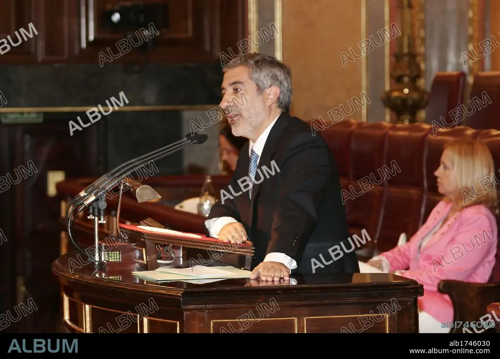 Gaspar Llamazares Trigo (b. 1957). Spanish politician. Leader of the political coalition Izquierda Unida (IU) from 2000 to 2008, holding the position of general coordinator. Llamazares in the Congress of Deputies. Madrid, May 25, 2005.