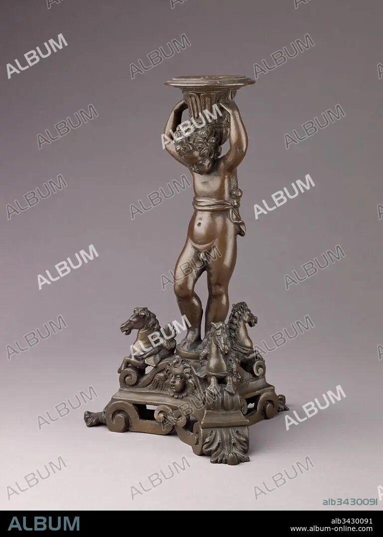 Candlestick in the form of a Putto, ca. 1600 or later, Italian, Venice, Bronze (Copper alloy with a dull patina varying from a reddish to olive green color)., H. 26.7 cm., Metalwork.
