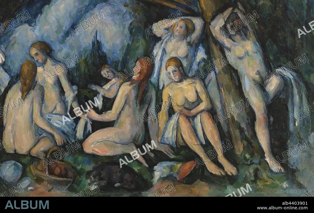 Paul Cézanne: The Large Bathers (Les Grandes baigneuses), Paul Cézanne, 1895–1906, Oil on canvas, Note: This work has been temporarily removed from display for technical study and conservation treatment. Funding for its conservation was generously provided through a grant from the Bank of America Art Conservation Project. This is one of three monumental bathing scenes that Cézanne produced at the very end of his career. Thick with paint, the canvas seems to have occupied him, on and off, for about ten years, between 1895 and 1906. The theme of bathers in a landscape originated in the Renaissance and traditionally showed idealized female bodies in total harmony with nature. Here, Cézanne disturbs this easy relationship. Space is hard to read, and the landscape—note the dead tree branches and ominous clouds—seems harsh and threatening. As for the figures, many of the poses are derived from classical statuary, but Cézanne overturns tradition as soon as he references it: bodies are deliberately distorted, with obliterated faces, truncated limbs and uneven flesh. Look especially at the standing figure at left. She once had a head, but Cézanne painted it out., Overall: 52 1/8 x 86 1/4 in. (132.4 x 219.1 cm)