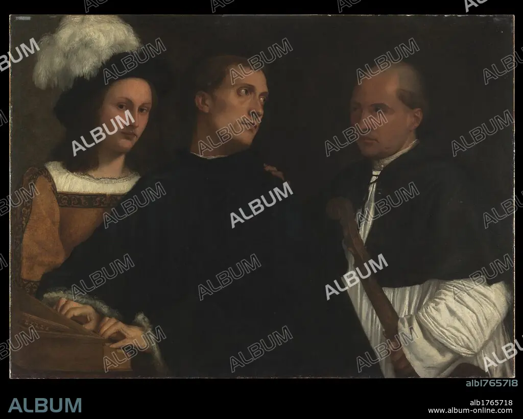 Italy, Tuscany, Florence, Palazzo Pitti, Palatine Gallery. All. Triple portrait concert men young man plumed feathered hat feather monk musician player musical instruments, probably organ, dress white cape spinet lute black.