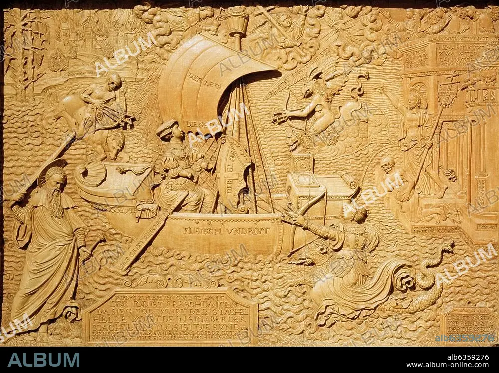 Dell, Peter d. Ä. geb. 1501. "Allegorie auf den christlichen Heilsweg", 1534. Ahornholz, gebeizt, in jüngerem Rahmen, 51 × 72 cm. Inv. Nr. Pl. O. 2069. Leihgabe der Stadt Nürnberg. Nürnberg, Germanisches Nationalmuseum.