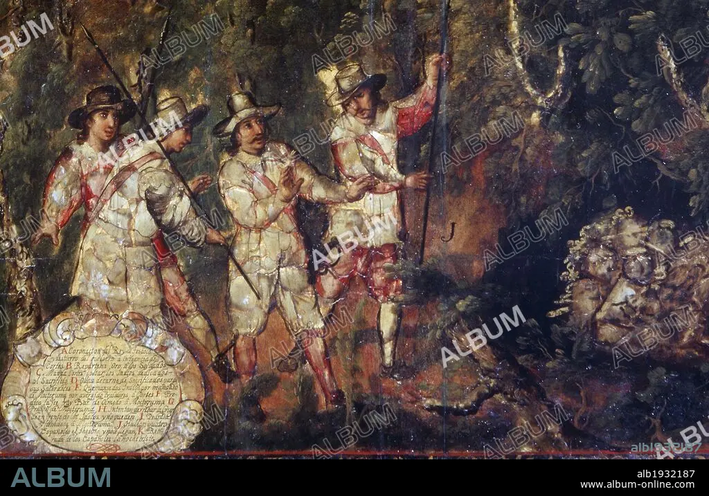 CONQUISTA DE MEXICO (1519). "HALLAN CUATRO ESPAÑOLES EL TESORO Y NO SE LO LLEVAN". Detalle del cuadro enconchado de Miguel González de 1698. Museo de América. Madrid. España.