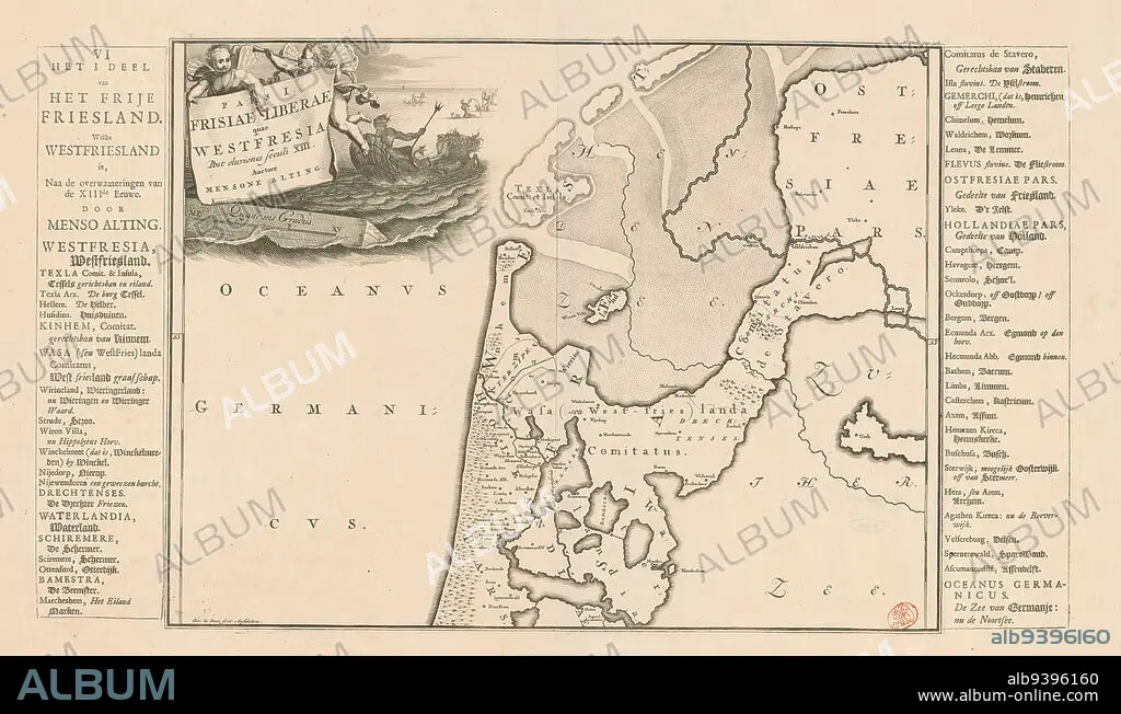 Historical map of the Netherlands with the territories of the Batavians and Frisians, Pars I Frisiae Liberae quae Westfresia (...) / The I part of the Free Friesland. Which Westfriesland is (...) (title on object), Map of Frisian areas in West Friesland in Roman times. Top left cartouche with title, above two putti. To the right of cartouche in background Neptune and several tritons. Scale stick below cartouche: Quadrans gradus. Degrees along left and right edges. Left and right of print strips of letterpress text with Dutch translation of title (upper left) and terms used on map., print maker: Gerrit de Broen (I), (mentioned on object), print maker: Joseph Mulder, (mentioned on object), after own design by: Joseph Mulder, (mentioned on object), print maker: Amsterdam, print maker: Netherlands, 1697 - 1700 and/or 1718 and/or 1725, paper, engraving, etching, letterpress printing, height 321 mm × width 422 mm, height 321 mm × width 556 mm