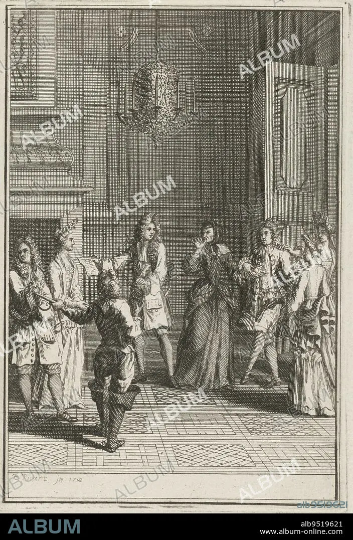 Elegant company in a room, Bernard Picart (workshop of), after Bernard Picart, 1712, A group of men and women are dancing in a room. An elderly lady looks with a stern gaze at a gentleman handing a letter to a lady., print maker: Bernard Picart, (workshop of), Bernard Picart, (mentioned on object), Amsterdam, 1712, paper, etching, engraving, h 138 mm × w 88 mm