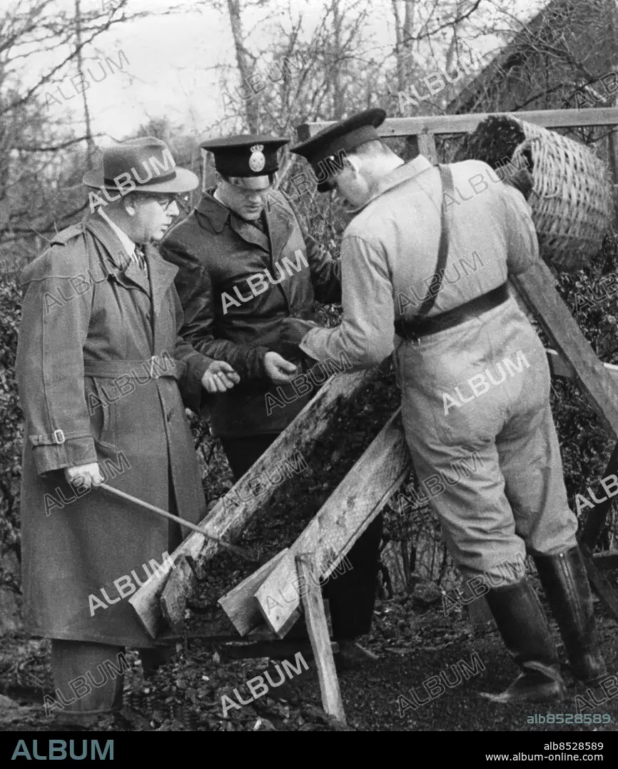 Massmördaren Tore Hedin i Skåne 1951 - 1952.. Mördade rånade rånmördade kvarnägaren Allan Nilsson i Tjörnarp nov 1951.. Här i mitten på bilden hjälper mångmördaren mördaren Tore Hedin själv till med utredningen av mordet. Det mord som han själv begått.. (c) Sydsvenskan / IBL Bildbyrå