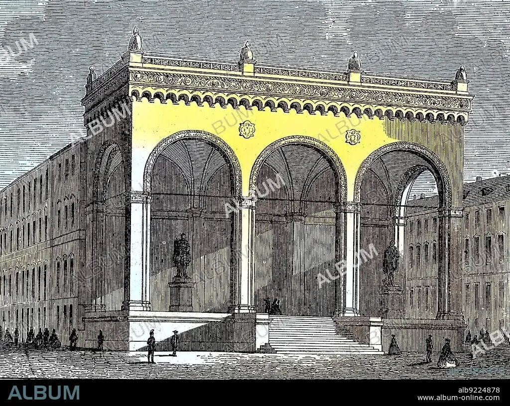 The Feldherrnhalle building in Munich, Bavaria, Germany, digitally restored reproduction of an original 19th century painting, exact original date unknown, Europe