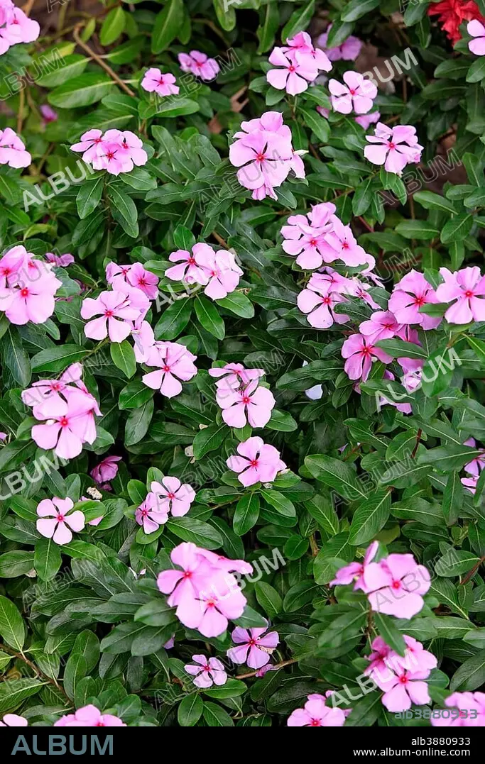 Madagascar Periwinkle (Catharanthus roseus), flowering, medicinal plant, Berenty Reserve, Madagascar, Africa.