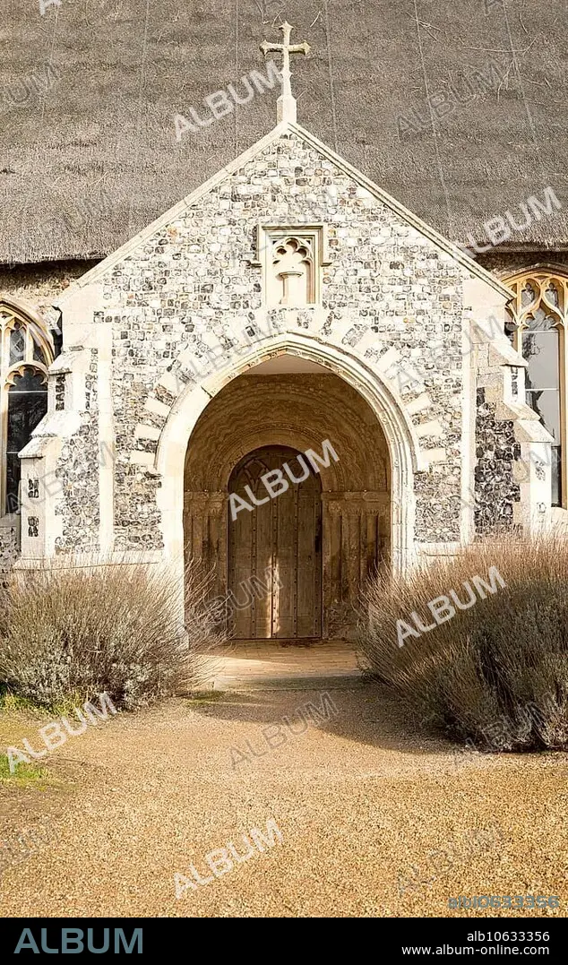 Entrance porch doorway village parish church and churchyard, Saint Mary, Henstead, Suffolk, England, UK
