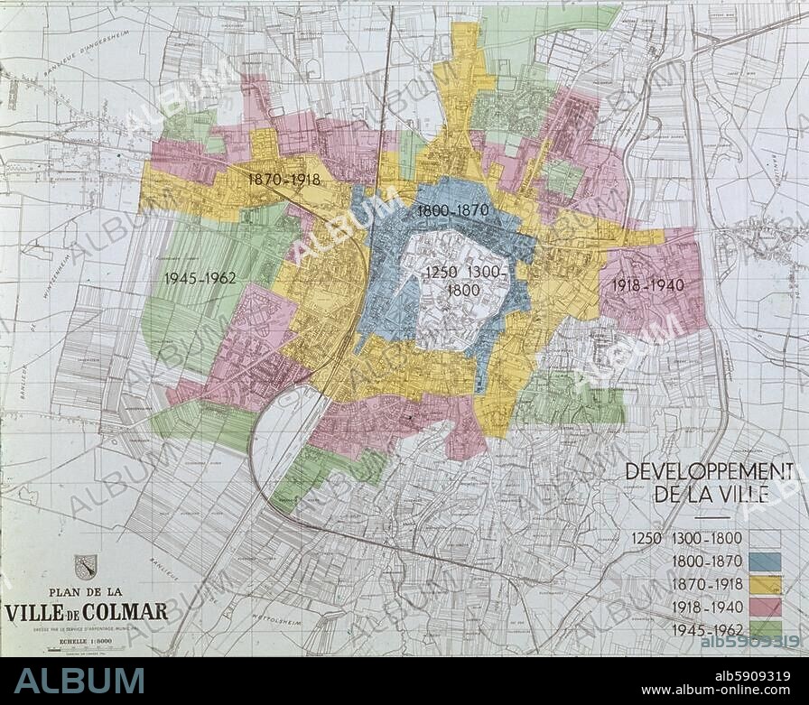 Colmar (Elsaß, Dép. Haut-Rhin, Frankreich). "Developpement de la ville" (Stadtplan zur Entwicklung der Stadt von 1250/1300 bis 1962.). Farbdruck.