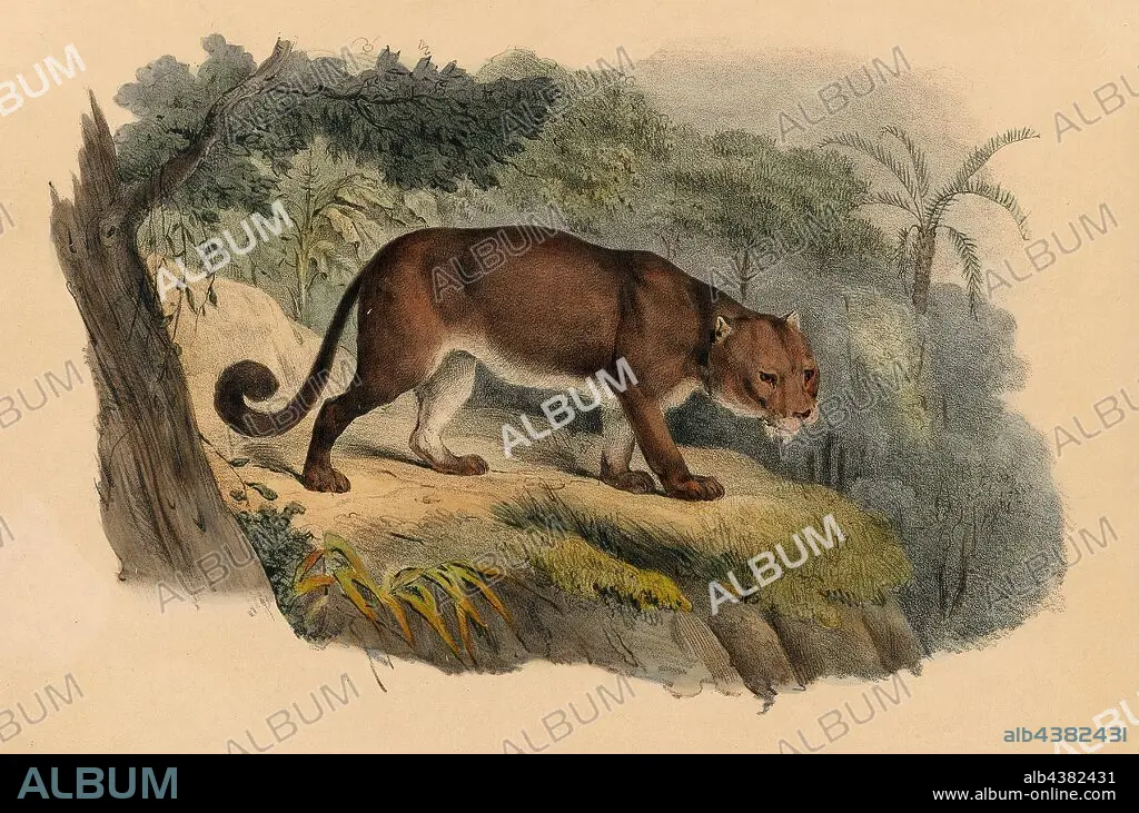 Felis concolor, Print, The cougar (Puma concolor), also commonly known by other names including mountain lion, panther, puma, and catamount, is a large felid of the subfamily Felinae native to the Americas. Its range, from the Canadian Yukon to the southern Andes of South America, is the widest of any large wild terrestrial mammal in the Western Hemisphere. An adaptable, generalist species, the cougar is found in most American habitat types. It is the biggest cat in North America, and the second-heaviest cat in the New World after the jaguar. Secretive and largely solitary by nature, the cougar is properly considered both nocturnal and crepuscular, although daytime sightings do occur. The cougar is more closely related to smaller felines, including the domestic cat (subfamily Felinae), than to any species of subfamily Pantherinae, of which only the jaguar is native to the Americas., 1842-1849