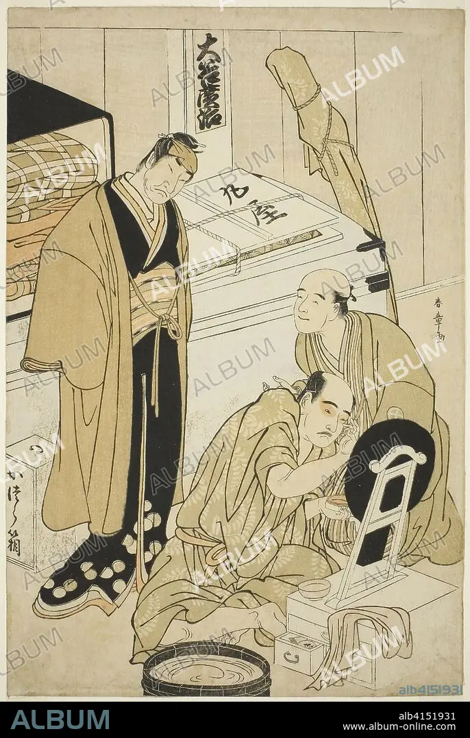 The Actor Otani Hiroji III in His Dressing Room Assisted by Otani Tokuji I (?) and Oberved by Nakamura Nakazo I (?). Katsukawa Shunsho ?? ??; Japanese, 1726-1792. Date: 1778-1788. Dimensions: 38.9 x 25.8 cm (15 3/8 x 10 1/8 in.). Color woodblock print; oban. Origin: Japan.