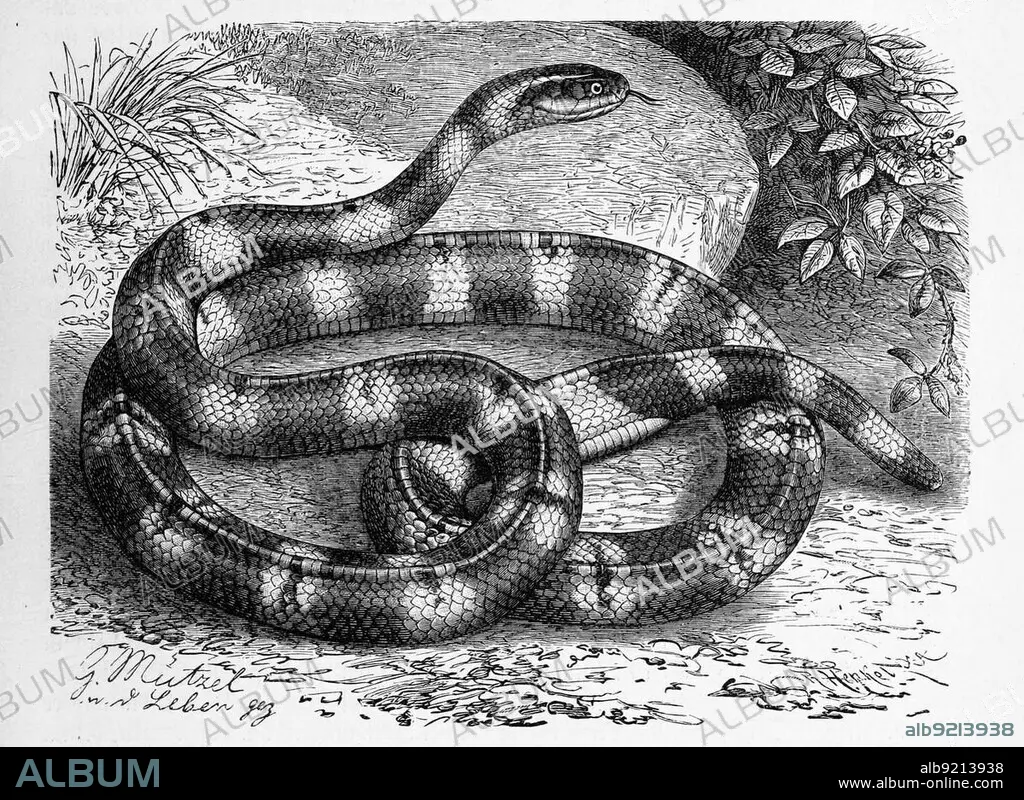 Reptiles, Yellow-banded krait (Bungarus fasciatus) is a venomous snake species and belongs within the venomous snake family, Historical, digitally restored reproduction from a 19th century original.