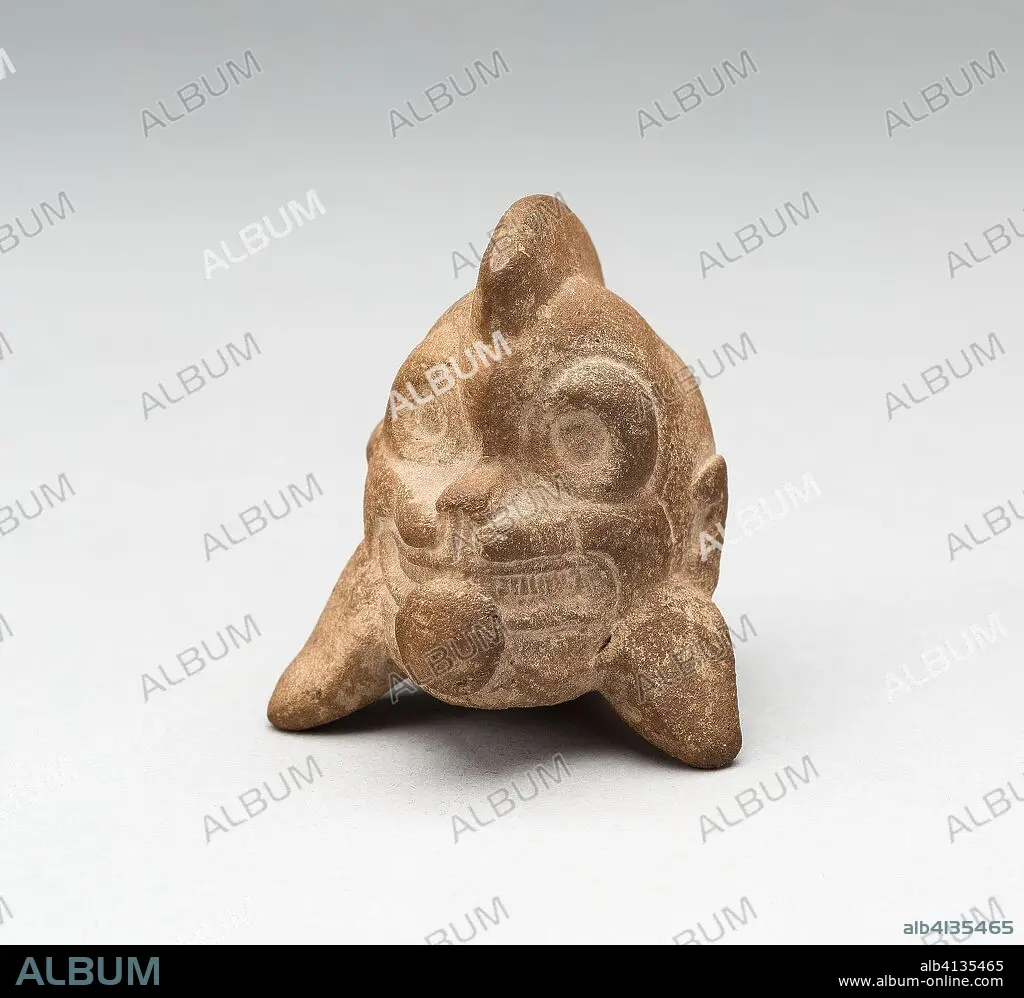 Whistle in the Form of the Head of a Jaguar. Possibly Jaina-style; Possibly Campeche, Mexico. Date: 250 AD-900 AD. Dimensions: . Ceramic and pigment. Origin: Campeche.