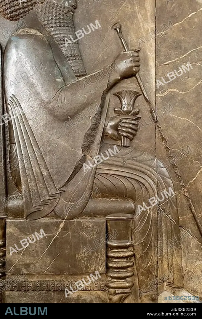 Ancient treasure house relief of the Achaemenids, audience relief of the Persian king Darius I, seated on the throne, archaeological relic from the ancient Persian city of Persepolis, National Museum of Iran, Tehran, Iran, Asia