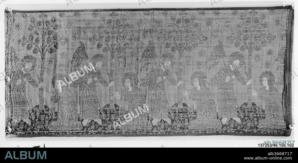 The textile depicts Christ immediately after the Resurrection at the moment when he is recognized by Mary Magdalene. This repeating design may have been used as a decorative border or apparel for a dalmatic. One half of a dalmatic made entirely of this fabric is in the collection of the Musée des Tissus in Lyon, France.