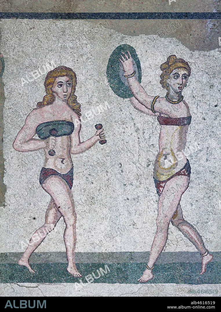 Piazza Armerina, Roman Villa of Casale, which was probably an imperial urban palace. Today it is a UNESCO World Heritage Site. Detail of the floor mosaic of the Room of the Girls representing athletes engaged in an athletics competition, wearing a two-piece swimsuit.. It can be said that the girls depicted show how the bikini is a Roman invention.
