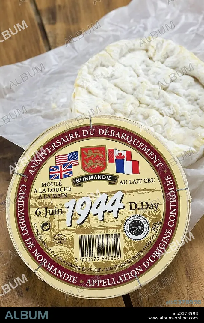 French Camembert cheese, raw milk cheese from Normandy, packaging in memory of the D-Day landings during World War II in Normandy, France, Europe