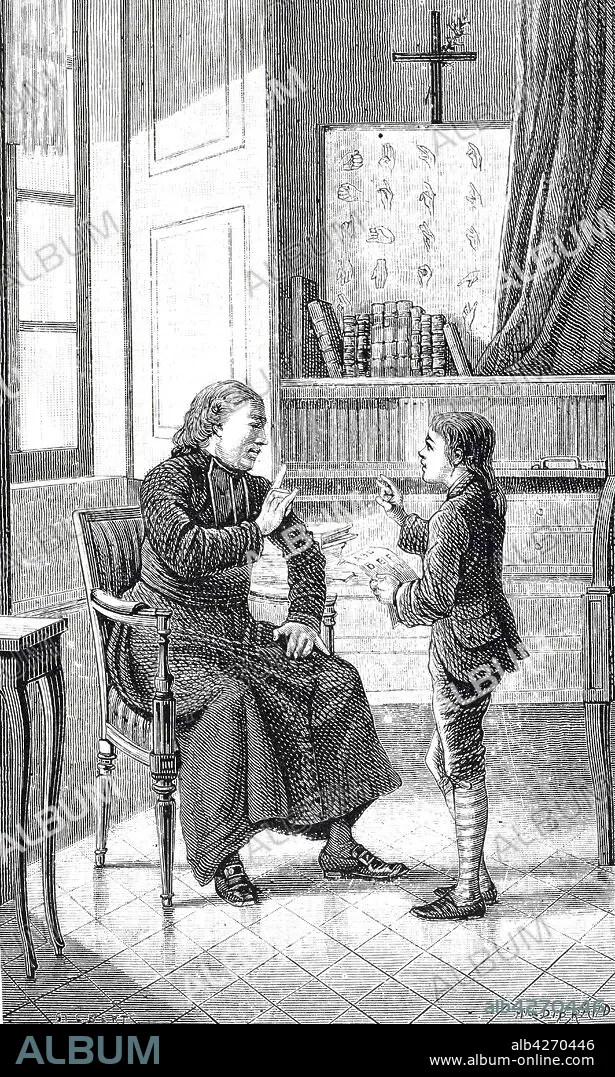An engraving depicting Charles-Michel de l'Epee teaching a deaf child sign language. Charles-Michel de l'Epee (1712-1789) a philanthropic educator. Dated 19th century.