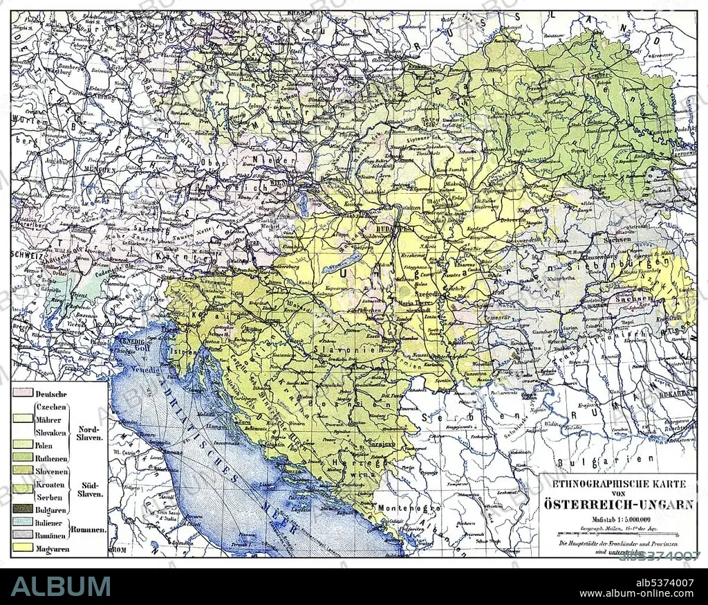 Historical map, ethnological map of Austria-Hungary, Dual Monarchy or kuk monarchy, for the period between 1867 and 1918, ethnic groups such as Germans, Slovaks, Moravians, Czechs, Poles, Serbs, Croats etc, 19th Century, from Meyers Konversations-Lexikon encyclopaedia, 1889