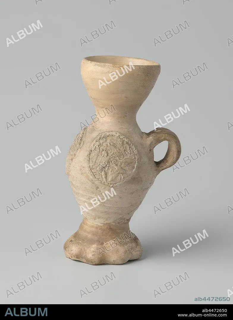 Beacker (trichternalbecher) with St John the Evangelist, Cup (funnel neck cup) of stoneware on wavy feet with an egg-shaped body and funnel-shaped neck. The C-shaped ear is attached to the shoulder. On the belly in relief three times a printed and imposed medallion with John the Evangelist with his eagle in a landscape. The inscription 'IOANVS' is above his head. Siegburg., anonymous, Siegburg, c. 1560 - c. 1590, stoneware, glaze, vitrification, h 13.6 cm d 5.6 cm d 6.2 cm d 5.6 cm w 7.7 cm