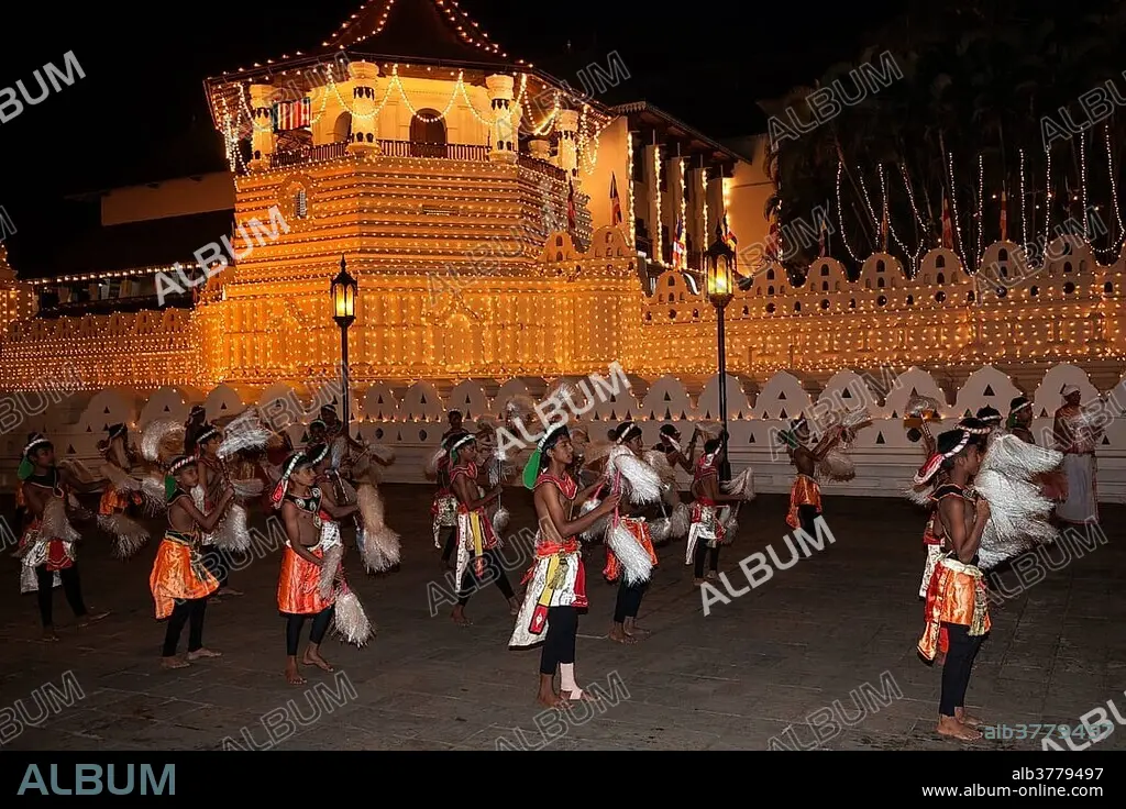 Dance troupe, Kandy Dancers in traditional costumes, Esala Perahera Buddhist festival, Sri Dalada Maligawa or Temple of the Sacred Tooth Relic, Kandy, Central Province, Sri Lanka, Asia