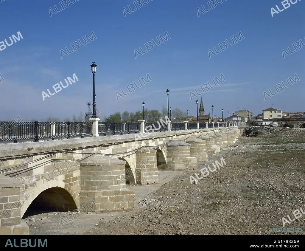 LA RIOJA. SANTO DOMINGO DE LA CALZADA. Vista general del PUENTE DE PIEDRA sobre el río OJA, que marca la entrada a la ciudad por la ruta de peregrinos. España. CAMINO DE SANTIAGO.