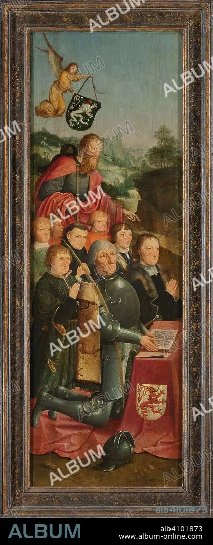 Memorial Panel with Eight Male Portraits, probably Willem Jelysz van Soutelande and Family, with Saint James the Greater and the Van Soutelande Family Crest, inner left wing of an altarpiece. Dating: c. 1515 - c. 1520. Measurements: support: h 101 cm × w 35.5 cm.