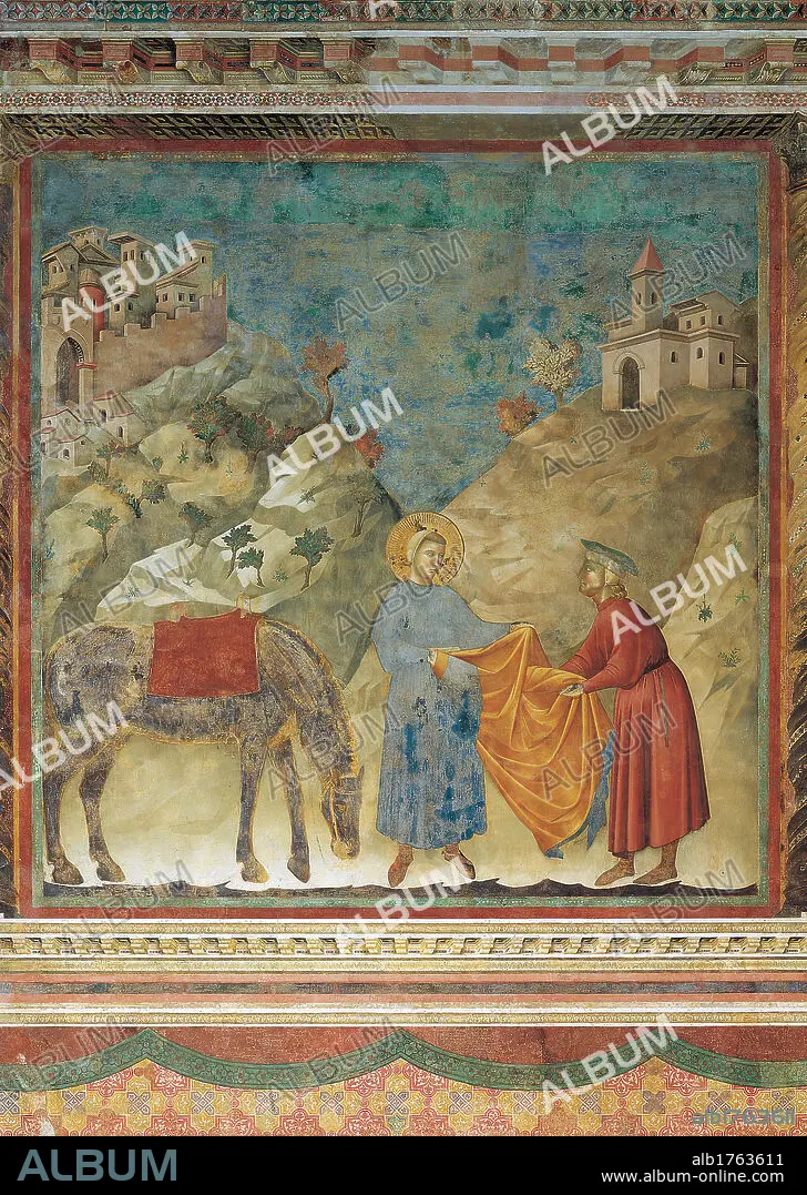 Italy, Umbria, Perugia, Assisi, Upper Basilica of San Francesco, nave. All. Saint Francis aureole halo horse saddle mantle cloak poor man gift present red light blue blue yellow landscape rocks city walls fortifications towers battlement crenellation.