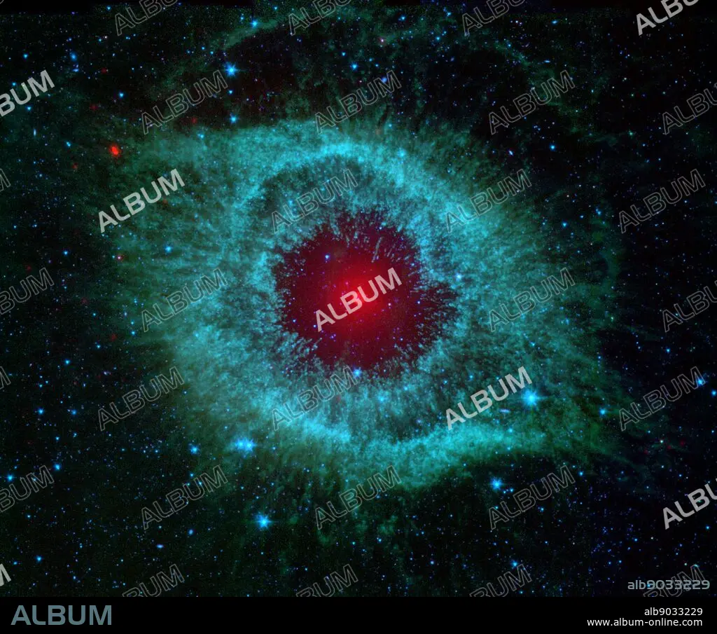 infrared image from NASA's Spitzer Space Telescope shows the Helix Nebula located about 700 light-years away in the constellation Aquarius, belongs to a class of objects called planetary nebulae. Planetary nebulae are the remains of stars that once looked a lot like the sun. When sun-like stars die, they puff out their outer gaseous layers. In Spitzer's infrared view of the Helix nebula, the eye looks more like that of a green monster's. Infrared light from the outer gaseous layers is represented in blues and greens. The white dwarf is visible as a tiny white dot in the center of the picture. The red color in the middle of the eye denotes the final layers of gas blown out when the star died. The brighter red circle in the very center is the glow of a dusty disk circling the white dwarf (the disk itself is too small to be resolved). This dust, discovered by Spitzer's infrared heat-seeking vision, was most likely kicked up by comets that survived the death of their star. Before the star died, its comets and possibly planets would have orbited the star in an orderly fashion.