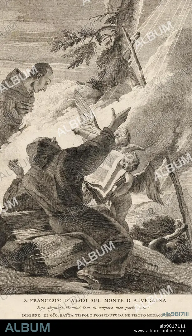 St. Francis of Assisi; Francis; Giovanni di Pietro di Bernardone; 1181 or 1182 to 3 October 1226; the founder of the Order of Friars Minor; Ordo fratrum minorum; Franciscans; The Stigmatisation of St. Francis; 1717; Historical; digitally restored reproduction from a 19th century original