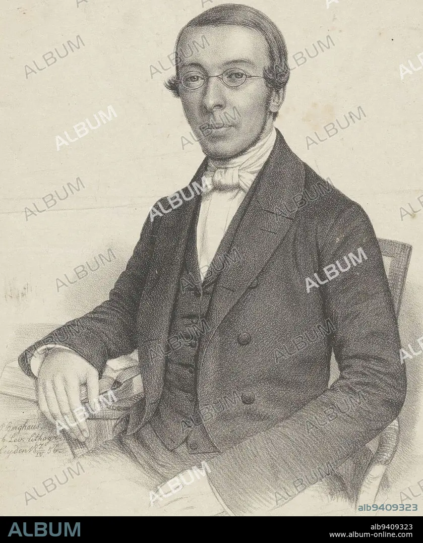 The person portrayed wears glasses and leans with his right arm on the table on an open book, Portrait of Jan Wouter Felix, print maker: Johann Peter Berghaus, (mentioned on object), Johann Peter Berghaus, (mentioned on object), Leiden, 7-Apr-1856, paper, h 335 mm - w 256 mm