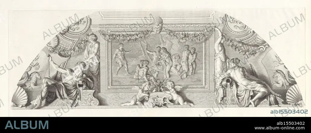 Untertitel: Siehe automatische Übersetzung Paris, Duchange, Gaspard, Lesueur, Eustache, Picart, Bernard, Duflos, Claude Augustin, The paintings of Charles le Brun and Eustache The Sueur who is in the house of President Lambert, Diana and Actaeon, stamped verso, Grisaille, with the representation of the hunter Actaeon, who finds Diana and her nymphs bathing, in the corner of the ceiling of the Chambre des Bains in the Hôtel Lambert. The representation is flanked by a river god and a river goddess, each with a water jug. Around the representation are ornaments and in the middle below two putti with coral. Print is part of a series of prints after the paintings in the Hôtel Lambert in Paris., print, prints, height 264 mm, width 675 mm, 1700-05-10 - 1786-02-27, print maker, printmaker, 1740 - 1740, first quarter 18th century, second quarter 18th century, paper, etching, etchings, engraving, engraving (printing process), Northern Netherlands, 1673-06-11 - 1733-05-08, supervision, French, 1617-11-19 - 1655-04-30, after, after painting by, Publication (Event), Publication, 1662-04 - 1757-01-06, publisher