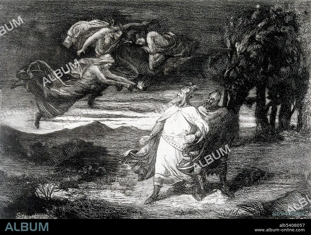 The three witches hover over Macbeth and Banquo in the opening scene from William Shakespeare's Macbeth. No date or artist credited.