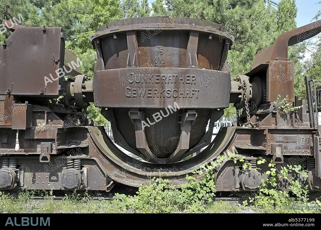 Rusty wagon for iron melt, Landschaftspark Duisburg-Nord landscape park, a former Thyssen blast furnace plant in Meiderich, Duisburg, North Rhine-Westphalia, Germany, Europe.